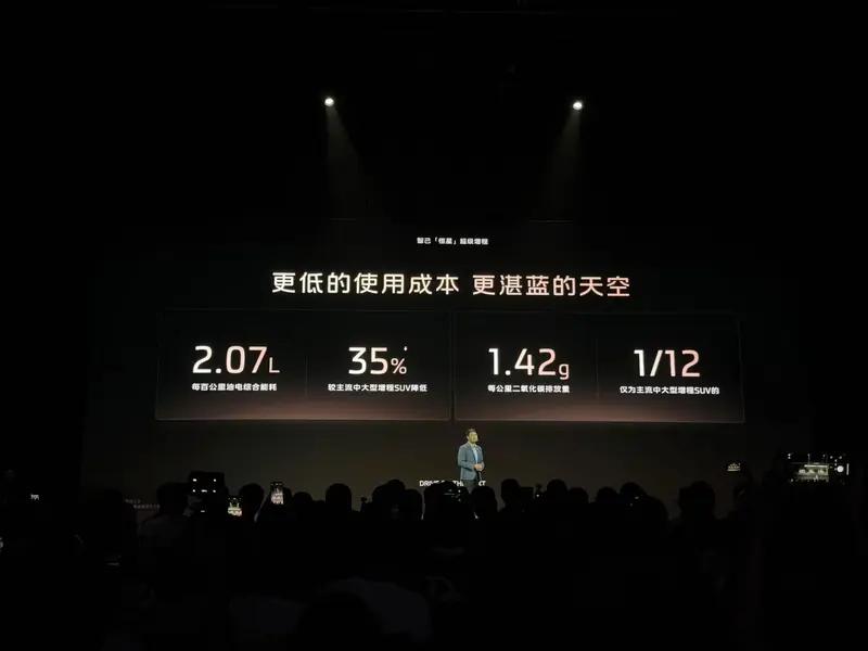 官方表示,该增程器可使用92号汽油,CLTC综合续航超1500公里。最低亏电油耗5.32L/100km,每百公里油电综合能耗2.07L,每公里二氧化碳排放量1.42g。