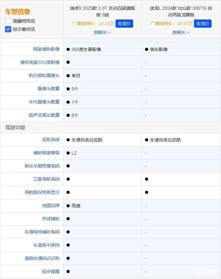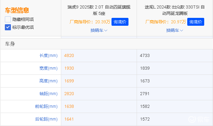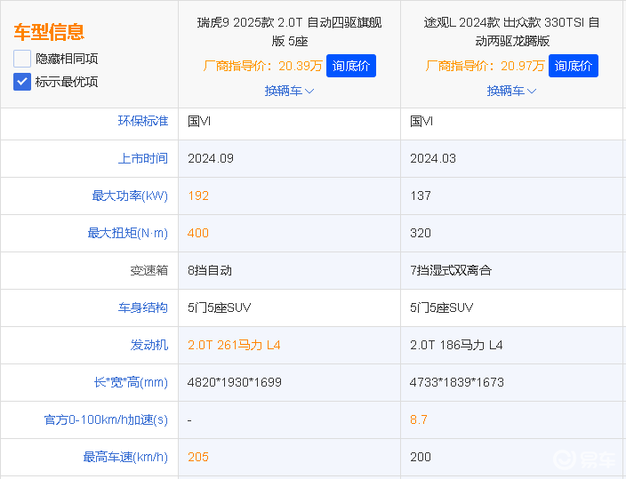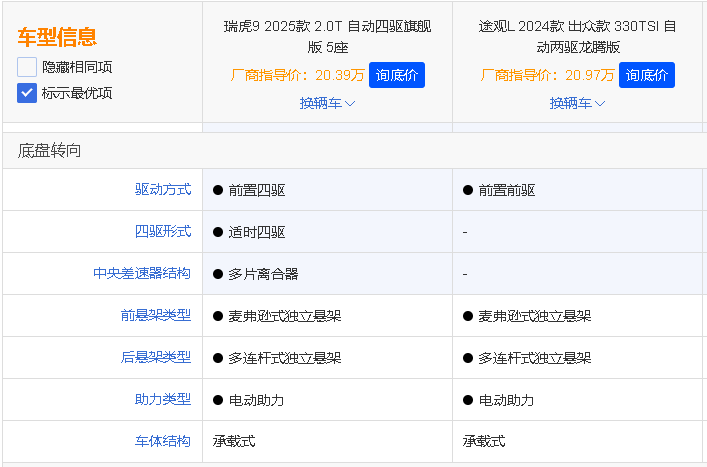 在一众中型SUV车型当中,凹凸君也特意挑选了两款具有代表性的车型,它们分别是自主旗舰SUV-瑞虎9,以及老牌强者--大众途观L,这两款车型在价格和定位方面相当具有对比性。在具体的车型选择上,凹凸君则分别选出售价20.39万元的2025款瑞虎9 2.0T-8AT 5座旗舰版(以下简称瑞虎9),以及售价20.97万元的大众途观L 330 TSI龙腾版(以下简称途观L),来一次近价位对比。