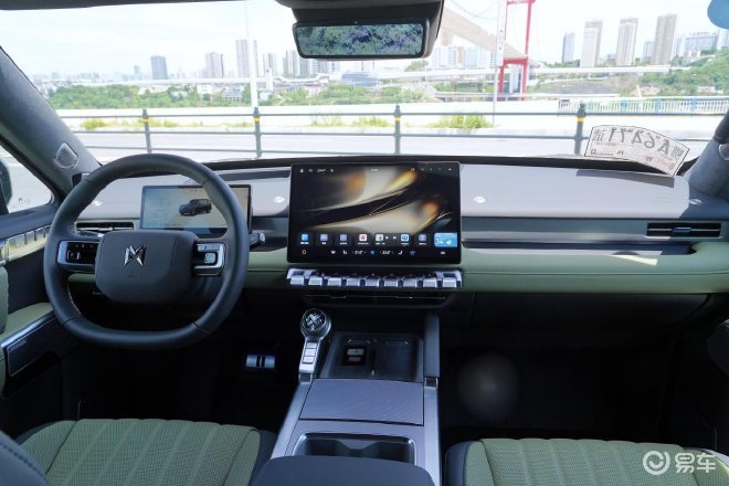 “全车6屏” 布局凸显科技感,12.3英寸仪表屏、21.6英寸华为智慧屏、W-HUD 抬头显示、流媒体内后视镜、飞航旋钮和后排控制屏,像一套精密的智能矩阵,却不显杂乱。