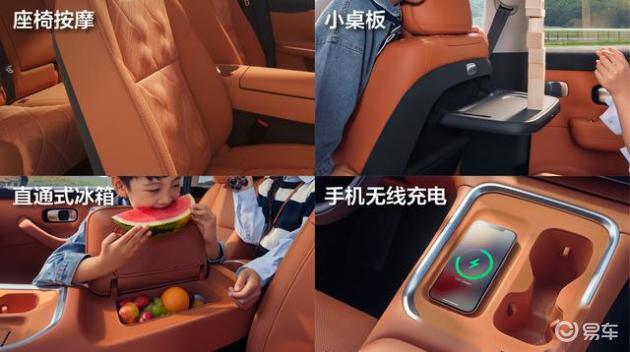 为了提高乘坐舒适性,无论5座还是6座,前排和二排座椅均配备加热、通风(吸风)和按摩功能,副驾靠背后方带有可自动调平和可语音控制的小桌板,前排中央扶手箱内含8.1L直通式冰箱(-6℃~50℃可调),console后端新增了纸巾盒,前排手机无线充电功率达到50W。