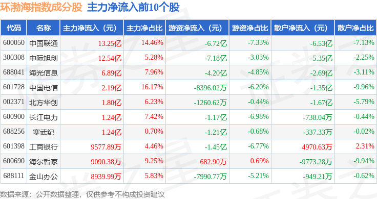 资金流向方面,环渤海(399357)指数成份股当日主力资金净流入合计32.1亿元,游资资金净流出合计22.05亿元,散户资金净流出合计10.06亿元。成份股资金流向详情见下表: