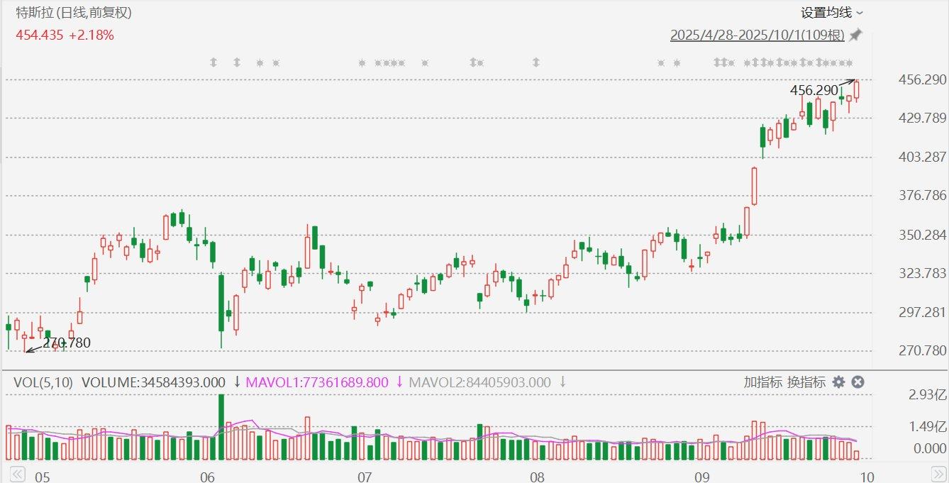 特斯拉(TSLA.US)短线拉升涨2.6%,报456.29美元,创年内新高,总市值重返1.5万亿美元。