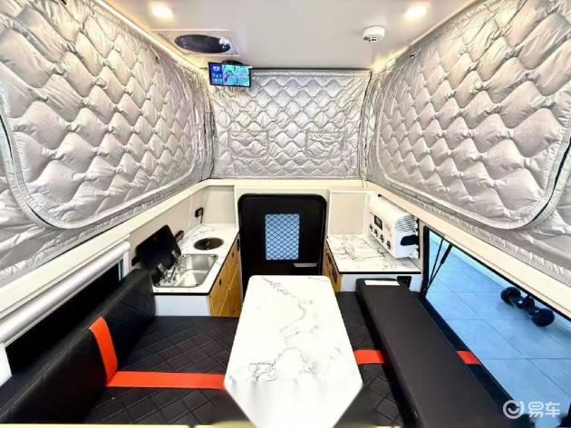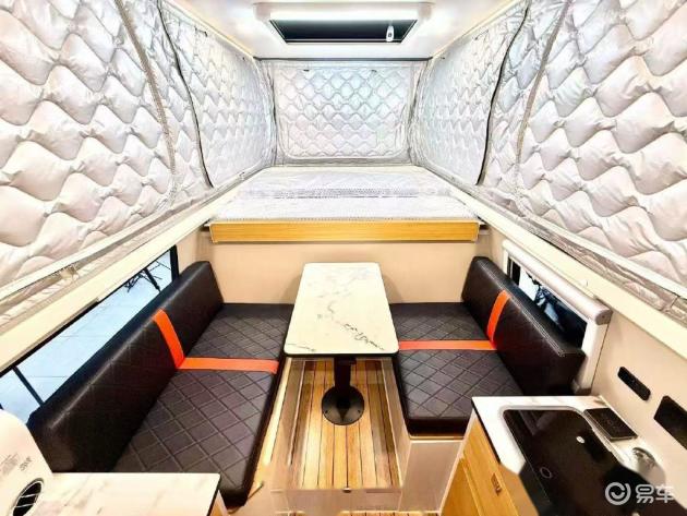 从外观上看,全黑色车身设计,适合喜欢改装的消费者。您可以选择升级为猛禽款式的越野轮胎、轮毂、前中网、前保险杠以及探照灯等。车身尺寸方面,长度为5.5米,高度为2.15米,通过性良好,无论是城市出行还是进出地库都不受影响。背驮款式方面,提供两种选择:一种是上下两层的背驮帐篷,即使是最简单的背驮款式,也具备合法手续和公告,无报废年限限制,且可以随时拆卸。另一种则是带有旅居功能的背投箱体,配备侧边帐篷、探照灯以及车内的水电设施,如冰箱、电磁炉、空调和柴油灶等,可满足数日的生活需求。这款车型不仅能够满足越野出行的需求,还能让您在户外享受自然风光。