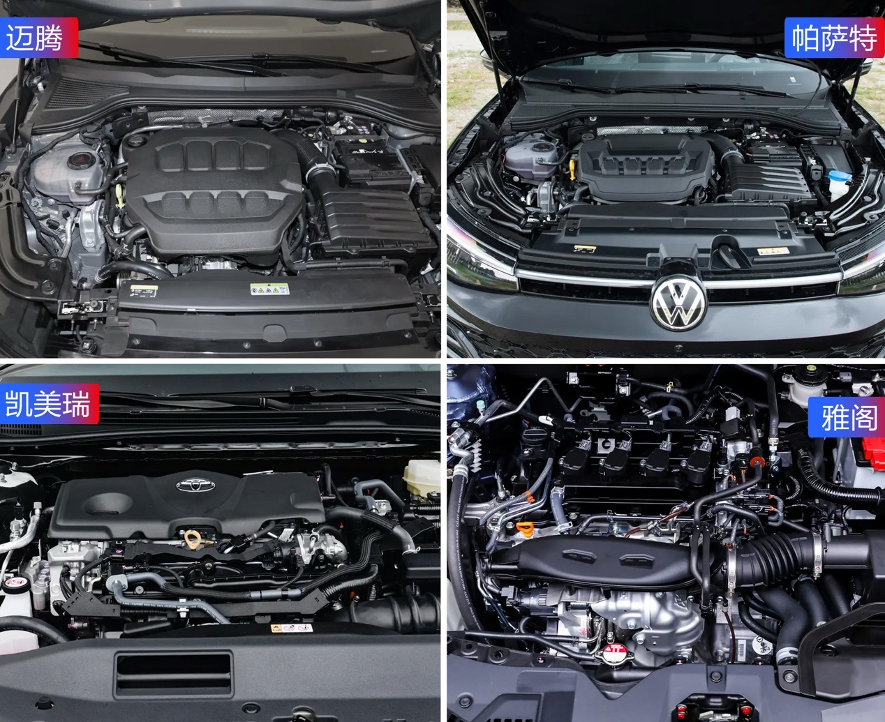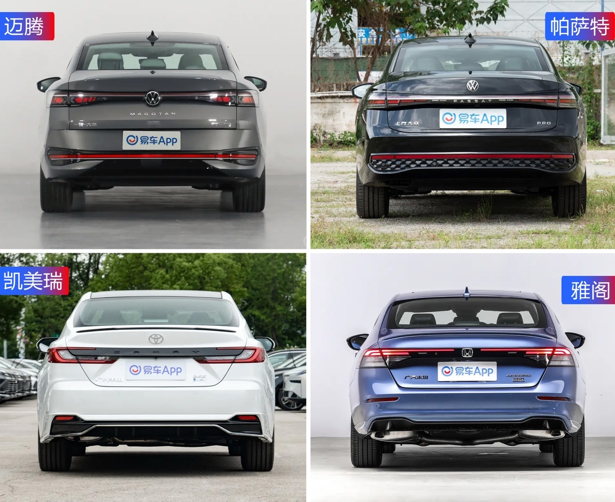 四辆车的造型设计都采用年轻化的风格,低矮、扁平是主旋律。迈腾的车头设计追求横向延展性和视觉宽度,进气格栅与大灯相连形成贯穿式灯带,视觉冲击力更强,辨识度也更高。前后LOGO在夜晚还能全部点亮,科技感和现代感直接拉满。帕萨特通过夸张的下包围造型来营造运动感,只不过和朗逸、凌渡的区别越来越小,快要分不清了。凯美瑞车头格栅区域狭长犀利,还加入了许多空力套件,在四周运动包围的烘托下,整车看上去更加低矮。雅阁的前包围造型很立体,再加上细长的头灯和点阵式格栅,整体视觉效果确实年轻了不少。