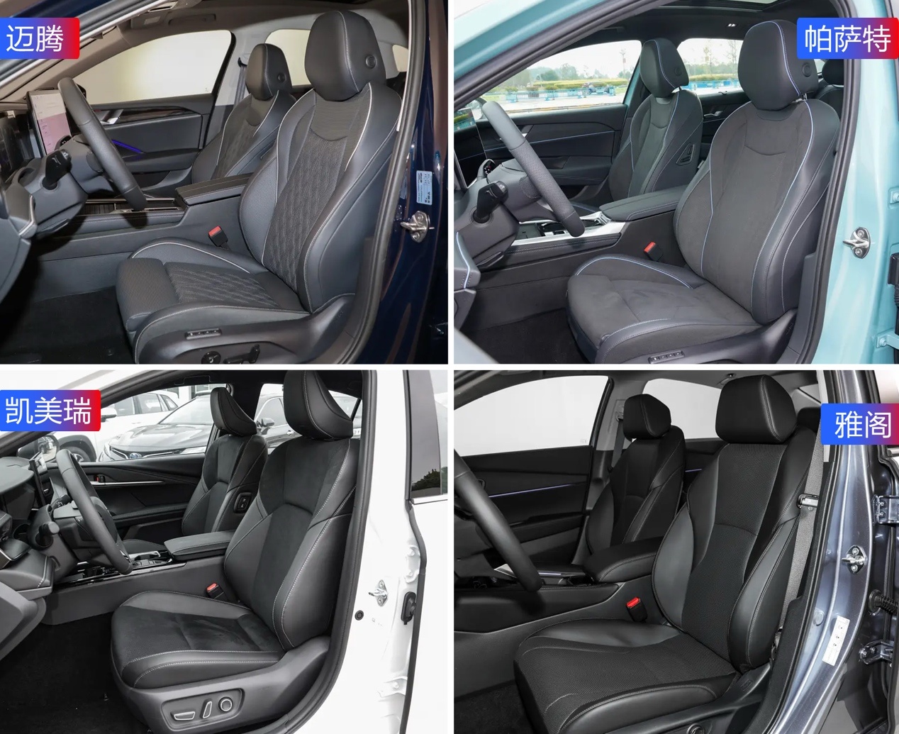 座椅方面帕萨特的表现最好,前后排标配加热、通风和按摩。迈腾次之,前后排加热功能需要选装。日系两强则是各有千秋,两车前排座椅都带有加热和通风,凯美瑞可以电动调节后排座椅,而雅阁则是给后排提供了加热功能。