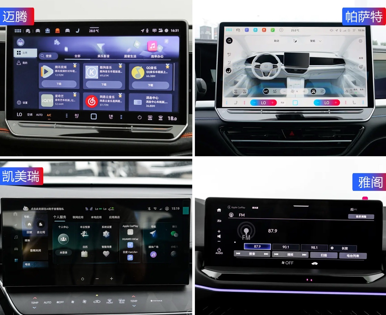 迈腾的15英寸中控屏分辨率达到2240*1260,屏幕表面镀有AR、AFR抗反射、防指纹涂层。车机搭载高通骁龙8155芯片,为了更好的适应国内市场,迈腾的语音控制系统基于科大讯飞语音助手,支持双音区识别响应,20s连续对话,多语言识别准确率达95%以上。此外像CarPlay、CarLife互联,车联网、OTA升级等功能也自然不会缺席。帕萨特的表现和迈腾差不多,凯美瑞和雅阁就要弱一些了,车机的功能性和语音系统的表现都一般,好在还有手机互联可以使用。