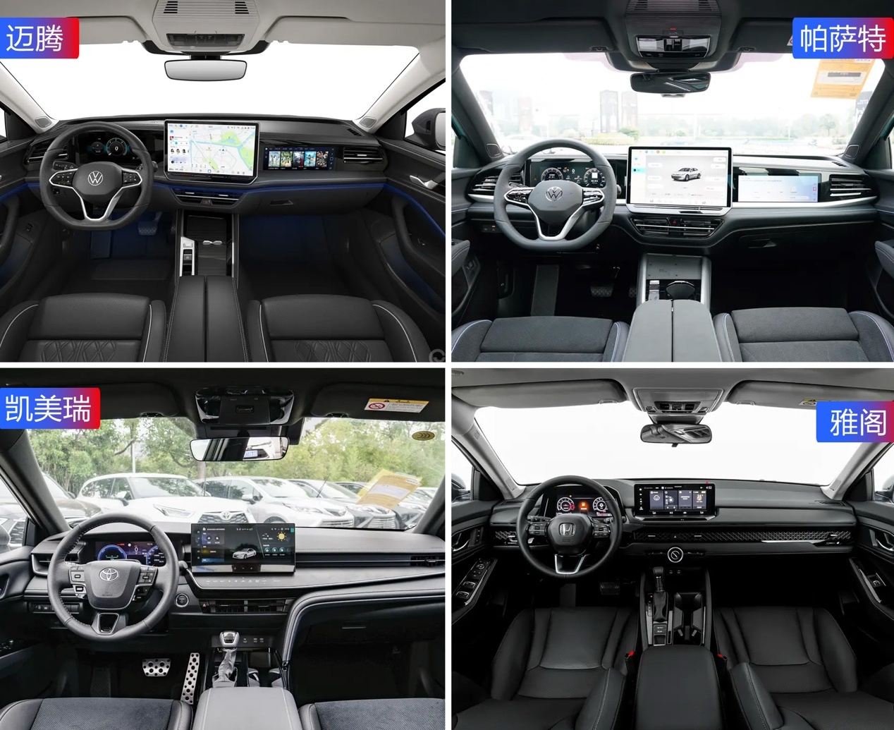 进到车内可以说是两两一组,迈腾和帕萨特都使用了10.25英寸仪表盘+15英寸中控屏+11.6英寸副驾驶娱乐屏外加HUD抬头显示,构成了车内四屏交互体验,带来极强的智能座舱数字感。凯美瑞则是双12.3英寸屏幕,这个尺寸以现在的眼光来看真不算大,并且也没有副驾屏。雅阁的中控屏同样是12.3英寸,但仪表盘尺寸要小一些,只有10.2英寸。