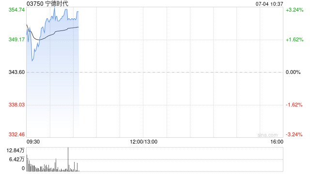 宁德时代(03750)早盘一度涨超4%,截至发稿,股价上涨2.68%,现报352.80港元,成交额7.58亿港元。