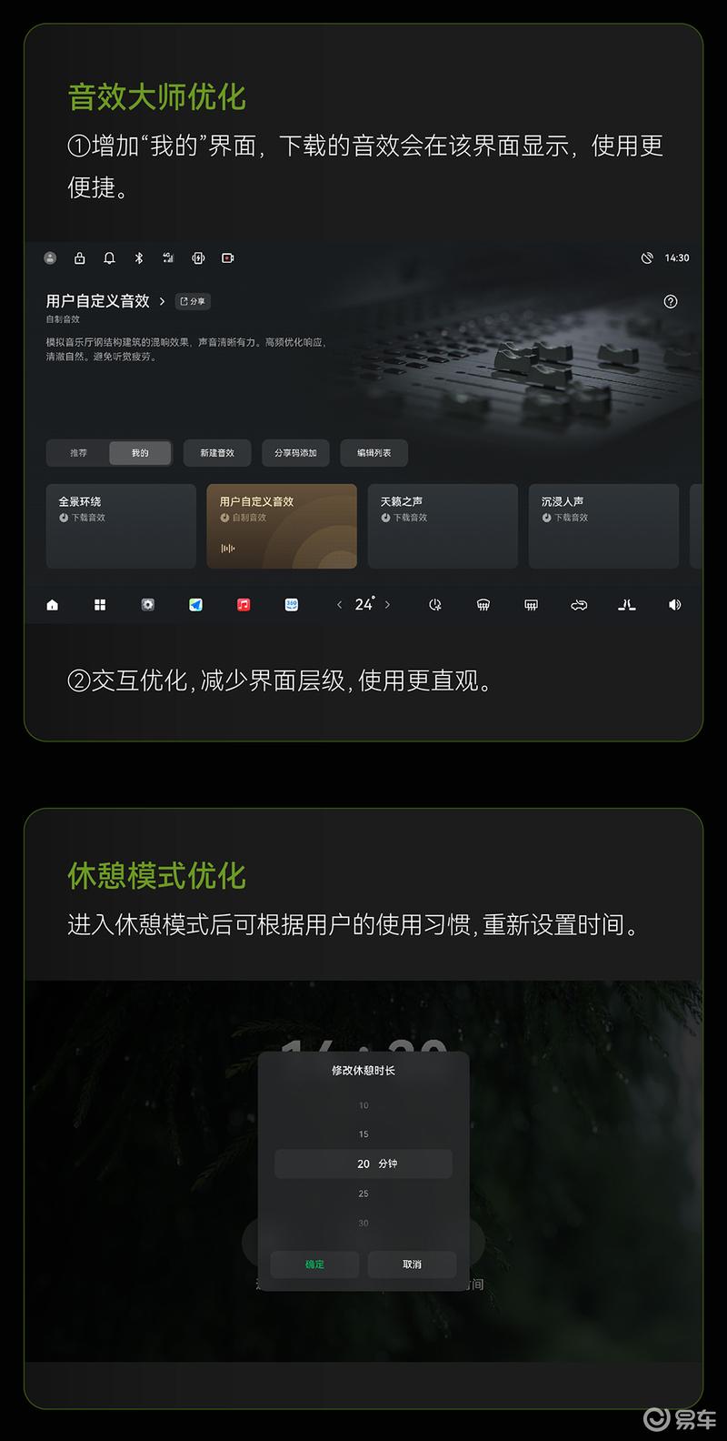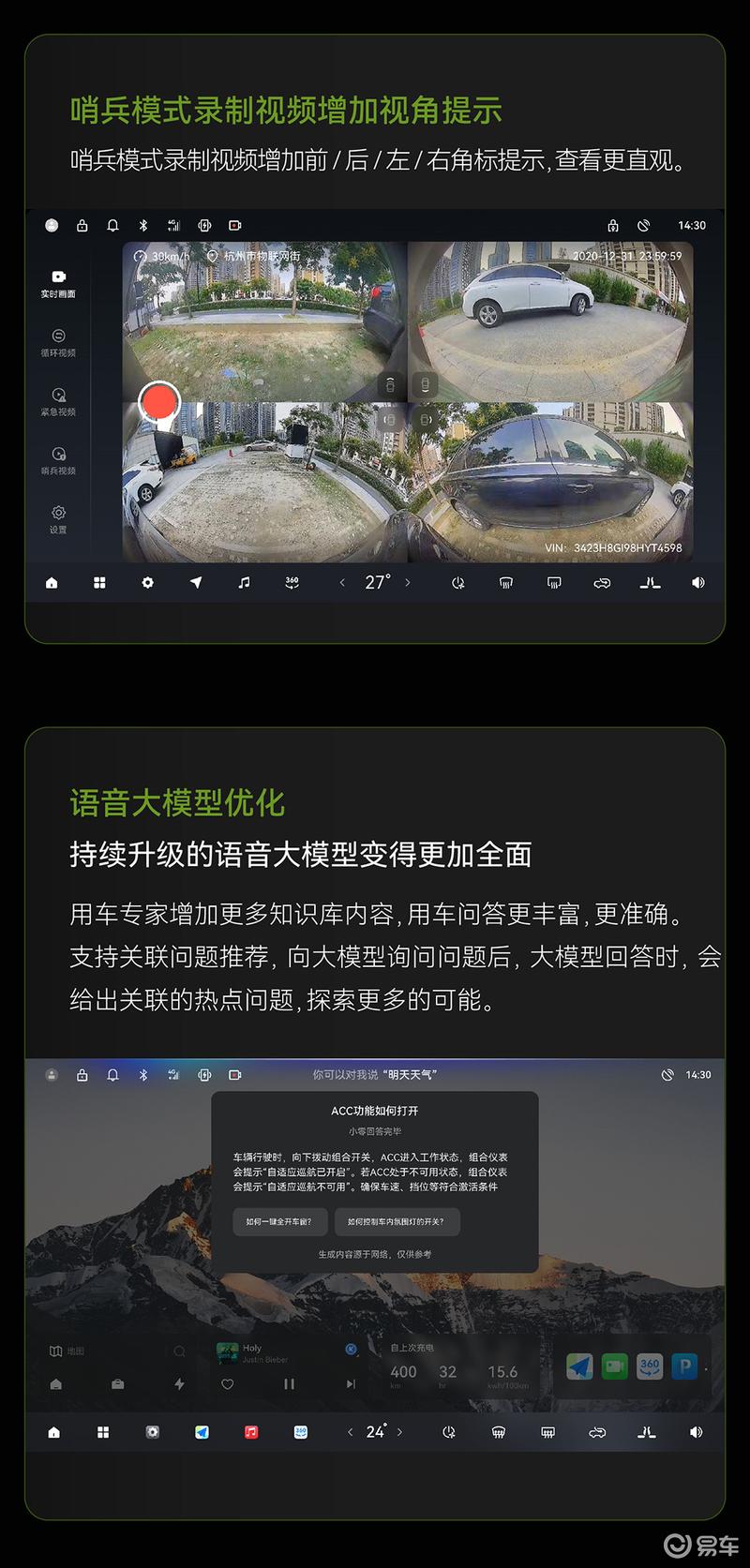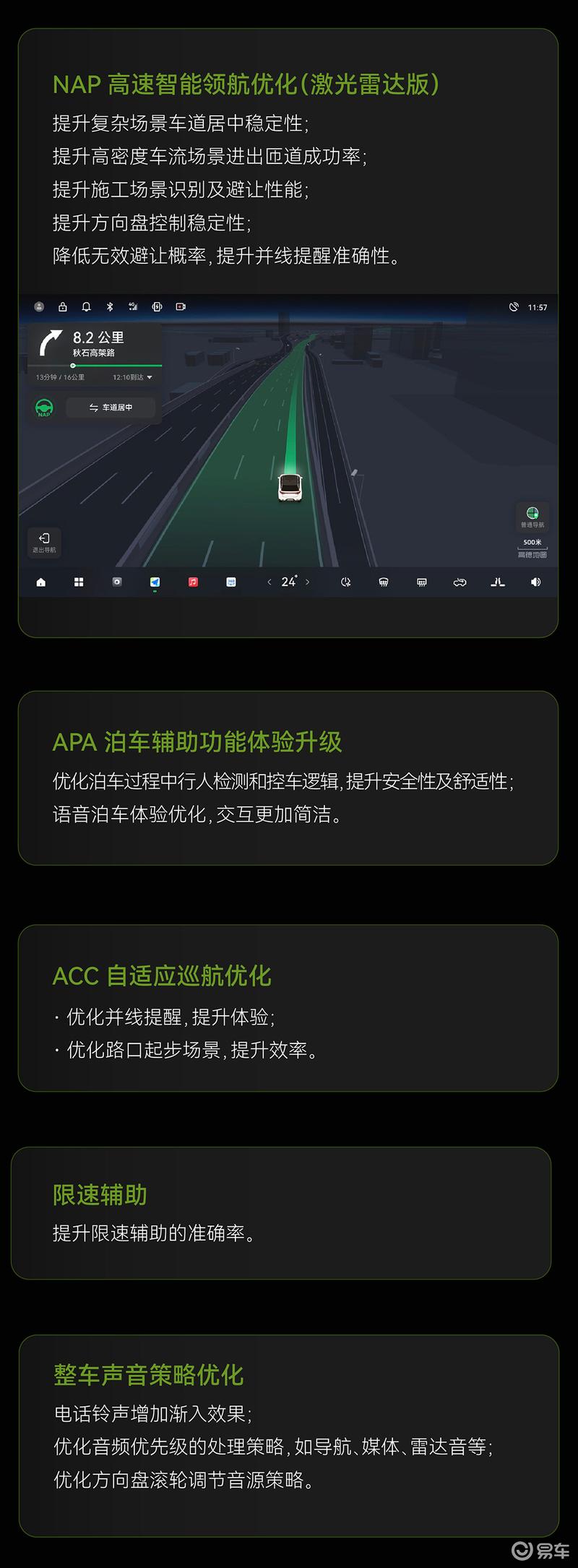 在功能优化方面,新版本还优化了蓝牙钥匙、零动空间、NAP高速智能领航(激光雷达版)、APA泊车辅助功能、ACC 自适应巡航、限速辅助、整车声音策略、哨兵模式录制视频增加视角提示、语音大模型、音效大师和休憩模式。