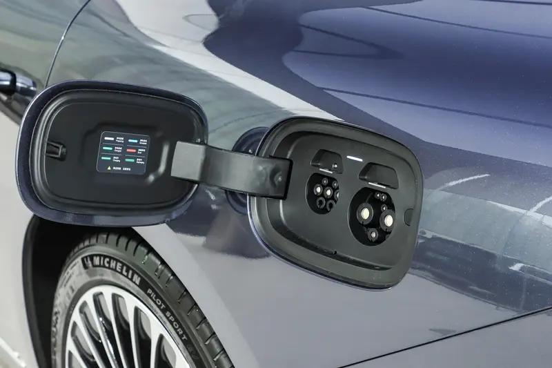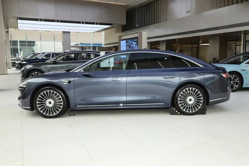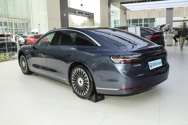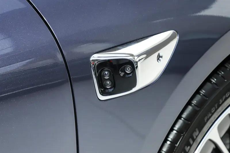 车身侧面,新车车顶线条采用了非常圆滑的弧形线条,车辆前后侧翼子板微宽出车身,腰线则平整的贯穿侧面,配合隐藏式门把手、米条辐轮圈等设计。车身尺寸方面,新车长宽高分别为5160*2005*1485mm,轴距为3050mm。来到车尾,新车采用贯穿式尾灯组设计,两侧光源呈现缓装设计,在点亮后具有不错的辨识度。