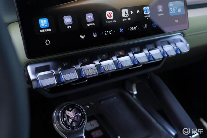 内饰方面,猛士M817中控屏幕下方保留了大量机械物理按键,兼顾硬派复古风,同时又带来更便捷的操作体验。飞航旋钮可玩性很高,可控制驾驶模式切换:标准/运动/AUTO/雪地/深雪/泥地/岩石/沙地/涉水,细节点缀科技感十足。