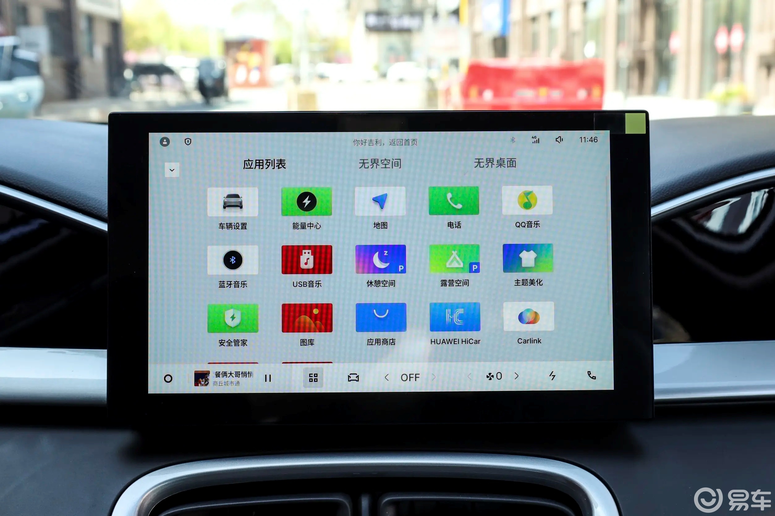 吉利星愿的内饰采用的是环抱式的左右对称式设计布局,这样的好处会显得副驾驶位有独立的空间,做到平等的表现,深色的内饰配色会显得有些沉闷,不过在中控台上配备了大量的银色镀铬装饰条,提升了一定的色彩感,两幅式的多功能方向盘大小尺寸适中,采用的是皮质的材质,仅支持上下调节功能,换挡形式为电子挡把,8.8英寸的液晶组合仪表盘分辨率还算出色,可查看行车信息较为丰富,中控台则搭载了一块带有Flyme Auto车载智能系统的10.1英寸液晶屏幕,智能化表现几乎是与极狐T1处于同一水平,而且也带有Carlink、Flyme Link以及HUAWEI HiCar三种手机互联映射功能,并且多出了应用商店拓展等功能,可以将常用的APP下载至车机屏幕上,方便了日常的使用。