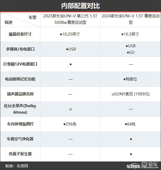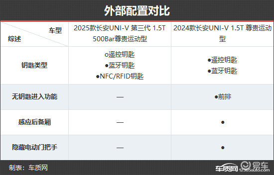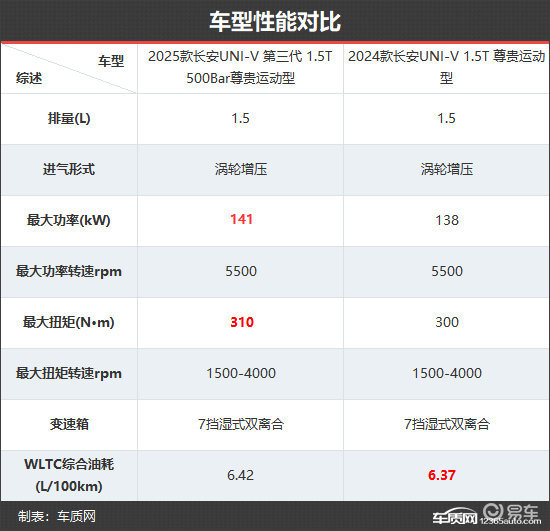 2025款长安UNI-V 第三代共推出4款车型,官方指导价为10.29-11.99万元。因为1.5T 500Bar尊贵运动型是4款车型中性价比最高的车型,因此本文选取这款车型作为参考,以便能够更加直观地看出新老款车型在综合竞争力方面的差异。