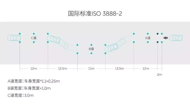 在该测试标准中,车辆以合适的车速直行进入测试区——长12米的A道,在松开电门、不踩刹车的情况下,打方向通过13.5米的距离切换至11米长的B道,然后再打方向通过12.5米的距离回到原本的行车道——长度12米的C道。