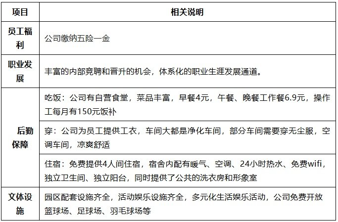 操作工要求身体健康,体检合格,无不良嗜好;初中及以上学历,能适应倒班,上六休一,以男工为主,月薪资范围为5000元~7500元;技工岗位月薪资范围为6000元~9000元,特殊专业技工人才薪资面议。