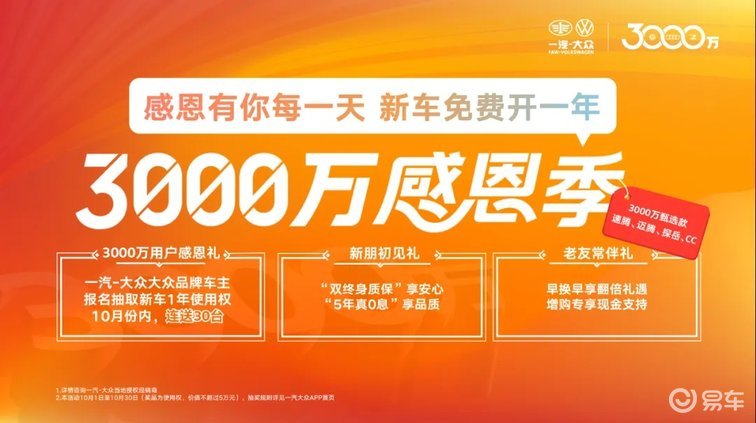 当前一汽-大众“3000万用户感恩礼”活动仍在火热进行中,10月27日前报名参与,即有机会在抽奖活动中获得大众品牌5款明星车型一年新车免费使用权。
