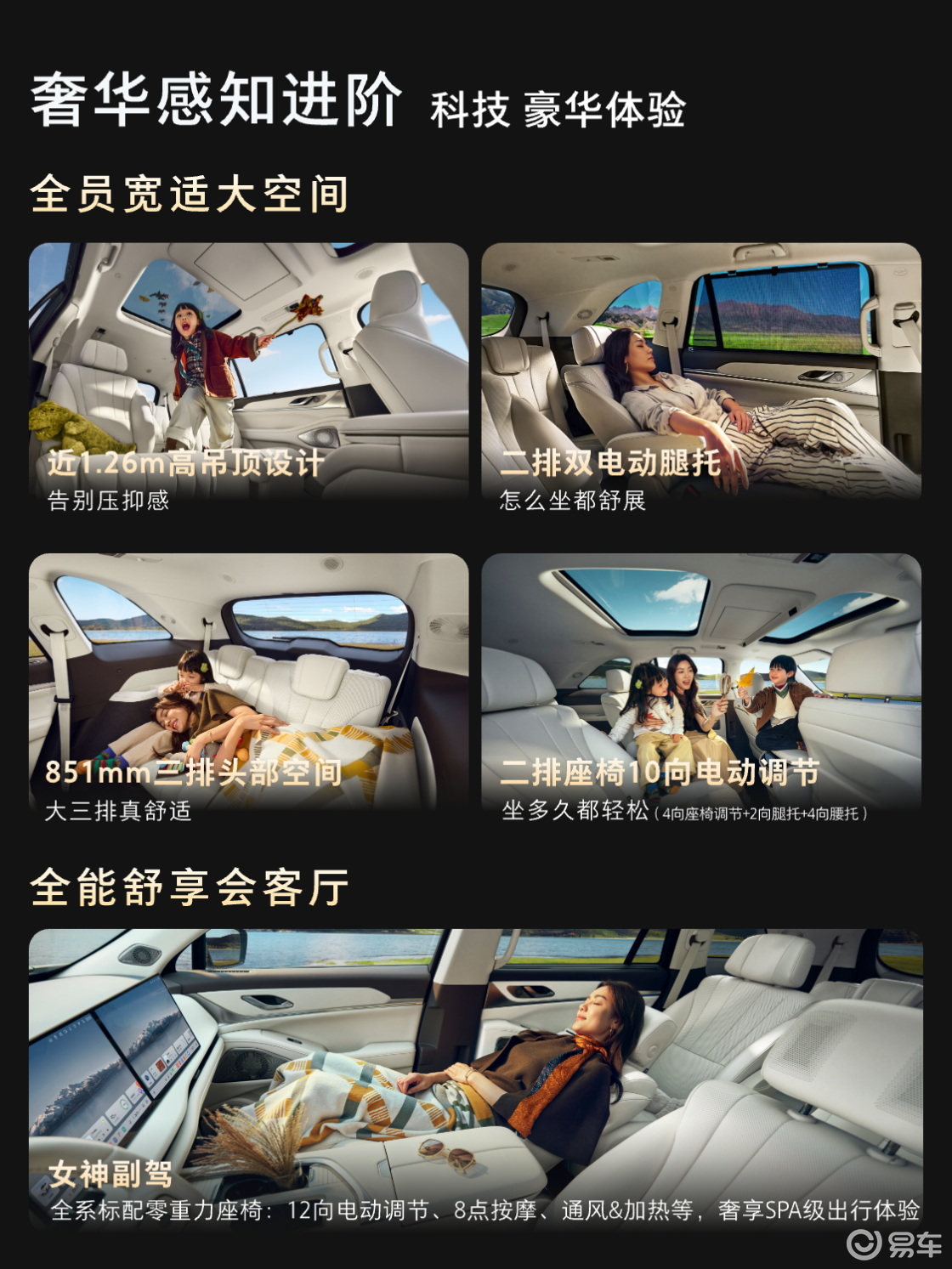 座舱方面,新车坚持“无主次平等关怀”的设计理念,打造豪华舒适的“五好座舱”。内饰采用大面积生态肤感NAPPA真皮与CIAA认证抗菌皮革包裹,搭配细腻的缝线工艺,质感十足;色彩搭配温馨柔和,配合多色氛围灯,营造出居家般的舒适氛围。全舱舒适配置全面覆盖三排座椅,主驾配备八点式按摩功能,副驾支持一键零重力模式,二排“头等舱”座椅带腿托调节且可一键拓展空间,第三排座椅宽大厚实,确保成人也能轻松乘坐。