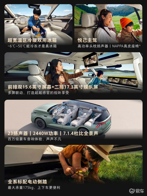 车内还配备-6℃-50℃温控的7L豪华大冰箱,满足全家出行的饮品保鲜需求。智能配置上,搭载Coffee OS 3.4系统,支持AI多屏扩画、晕动舒缓显示等贴心功能,其中晕动舒缓显示可有效缓解乘车看屏的晕车不适感;搭配23扬声器7.1.4全景声系统与后排17.3英寸3K高清娱乐屏,打造移动影院级体验,进一步提升全家出行的愉悦感。