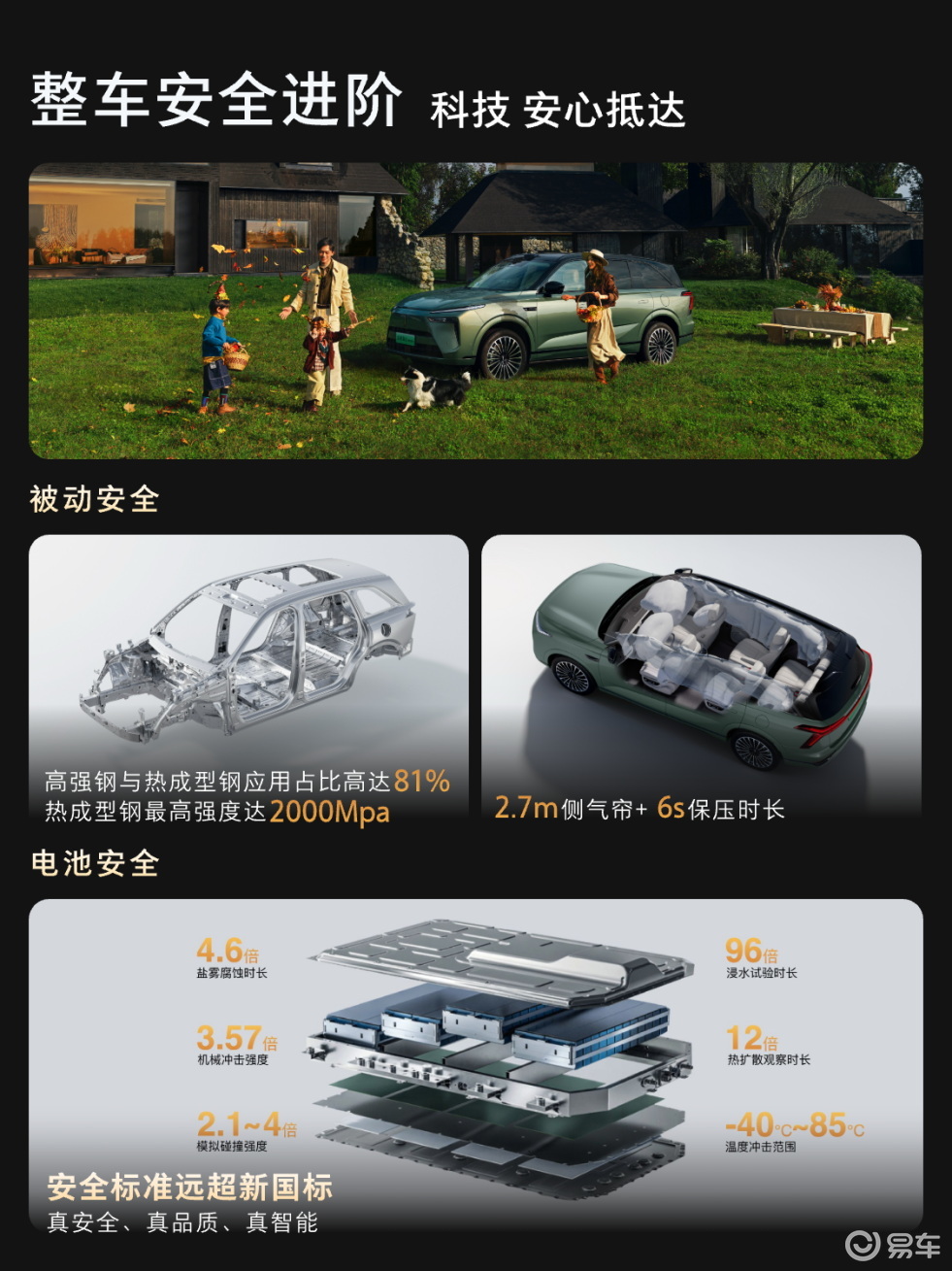 安全层面,新车延续“过度投入”传统,81%高强钢/热成型钢车身(关键部位强度2000兆帕)、远超国标的电池安全测试,叠加30余项智能辅助功能(含AEB,明年Q2将推送AES等),构建全维防护;座舱采用抗菌皮革、婴标空气质量控制,守护呼吸安全。