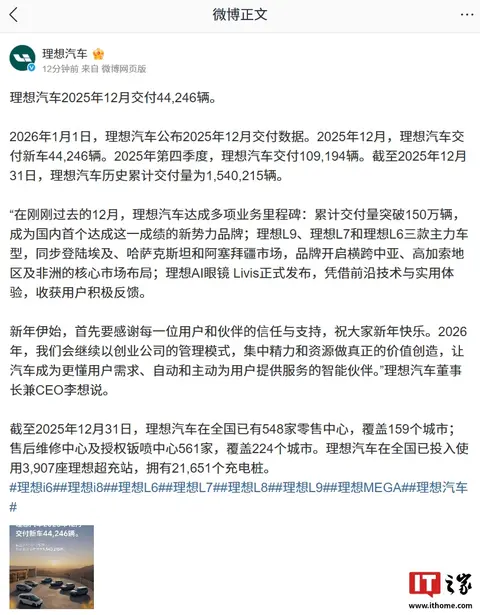 IT之家从理想汽车官方获悉,截至 2025 年 12 月 31 日,理想汽车在全国已有 548 家零售中心,覆盖 159 个城市;售后维修中心及授权钣喷中心 561 家,覆盖 224 个城市。理想汽车在全国已投入使用 3,907 座理想超充站,拥有 21,651 个充电桩。