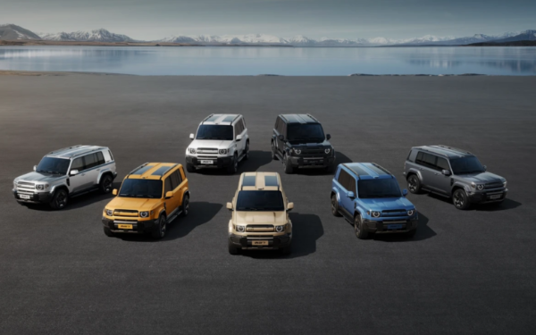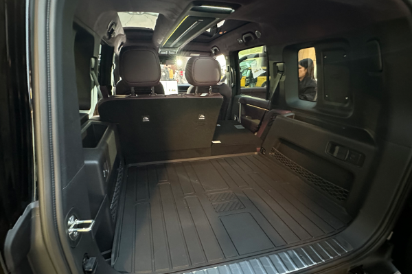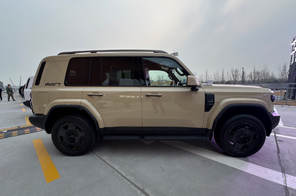 来到车身侧面,腰线简洁中透出精致,挺拔姿态带来超低窗线,配有高集成度侧翼子板科技岛,轮眉同样厚实很有质感,车窗、轮眉和轮毂都有熏黑黑化处理以及固定式脚踏板,传统机械门把手同样硬朗和大后视镜,车尾部配备了外挂小书包,全系标配背负式全尺寸备胎,积木式尾灯趣味十足,越野/城市双风格车位格外醒目具有辨识度。