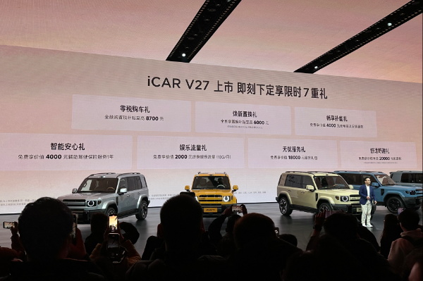 3月13日,iCAR V27在北京正式上市,新车提供两驱、四驱共3款配置车型,售价区间为16.98万元-19.68万元, 同时即可下定享限时7重礼,分别是:零购置税礼,焕新置换礼、畅享补能礼、智能安心礼、娱乐流量礼、无忧服务礼、舒适野趣礼。具体详情查询当地经销商。