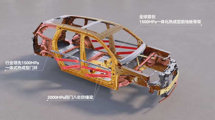 能有这表现,硬件的底子确实扎实。车身用了超过85%的高强钢和铝合金,其中近三成是热成型超高强钢。特别值得一提的是,它和宝钢一起搞了1500MPa的一体式热成型前地板骨架和门环,门槛梁还是十宫格结构的挤压铝。车门防撞梁更是怼到了2000MPa,这强度基本是潜艇用钢级别了。再配上五纵十一横六环的笼式车身结构,不管是单点冲击还是翻滚扭曲,车身框架都稳得住。