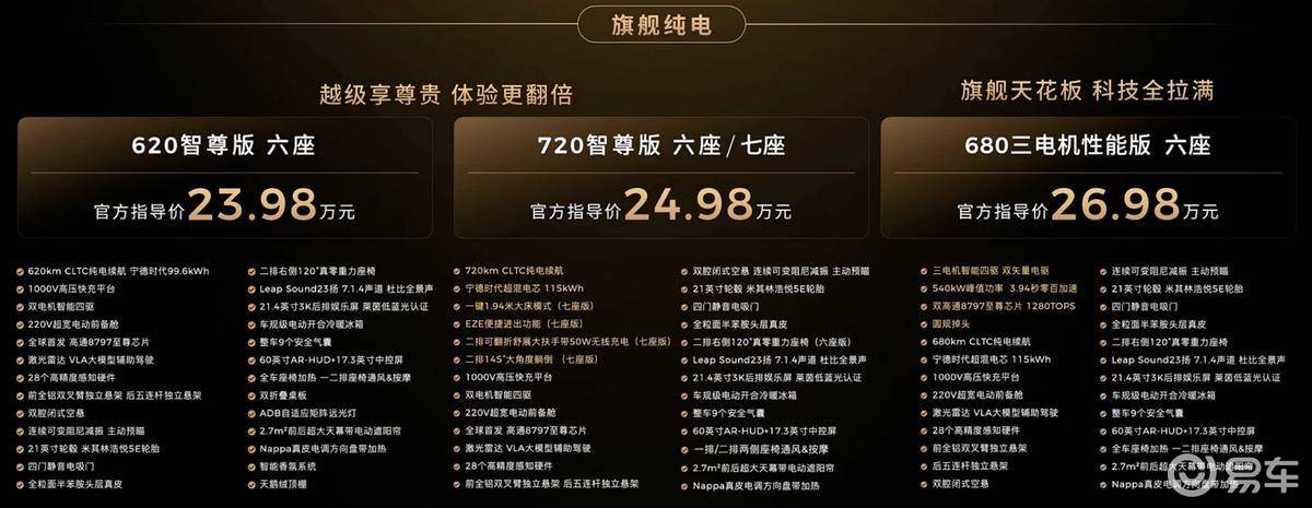 纯电620版:23.98万(六座);纯电720版:24.98万(可选六座/七座);纯电680三电机版:26.98万(六座)。