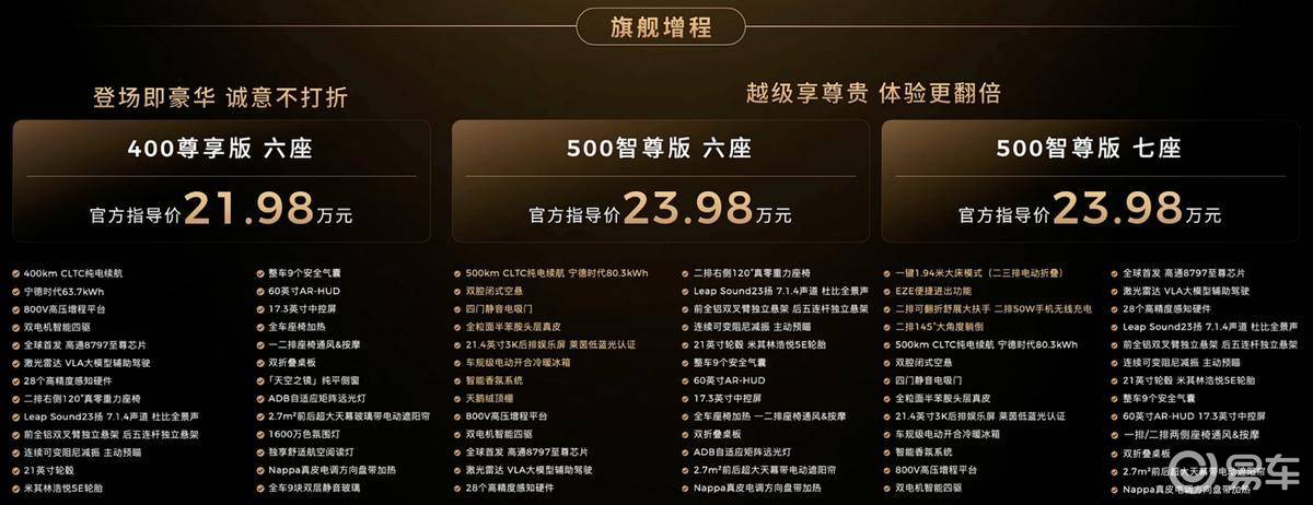 增程400版:21.98万(六座);增程500版:23.98万(可选六座/七座)。推荐增程500版。