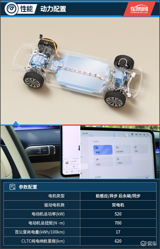动力方面,蔚来ET9采用全域900V高压架构和超充快换平台,搭载碳化硅高性能纯电四驱系统,电动机总功率520kW,总扭矩700N·m,官方百公里加速时间4.3s。电池搭载宁德时代的三元锂电池,CLTC纯电续航里程可达620km。另外,新车5分钟可补能255km,换电仅需3分钟。